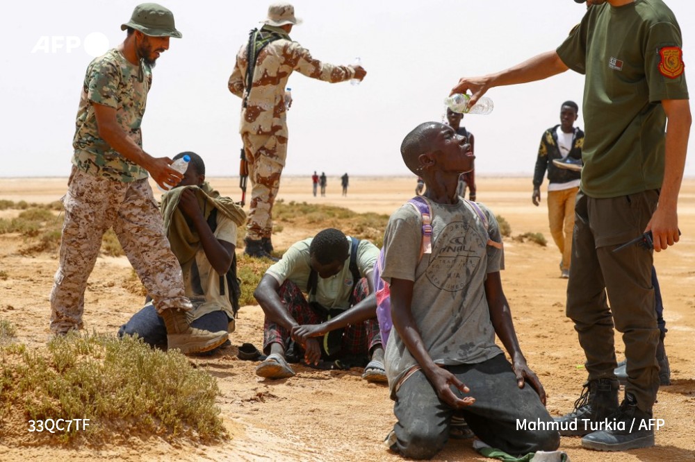 Taken on July 30, 2023, the photograph shows the moment when Libyan border guards provide water to a group of Sub-Saharan African migrants collapsed from exhaustion on the reddish-brown desert sand, near Al'Assah, 150 kilometres southwest of Tripoli.