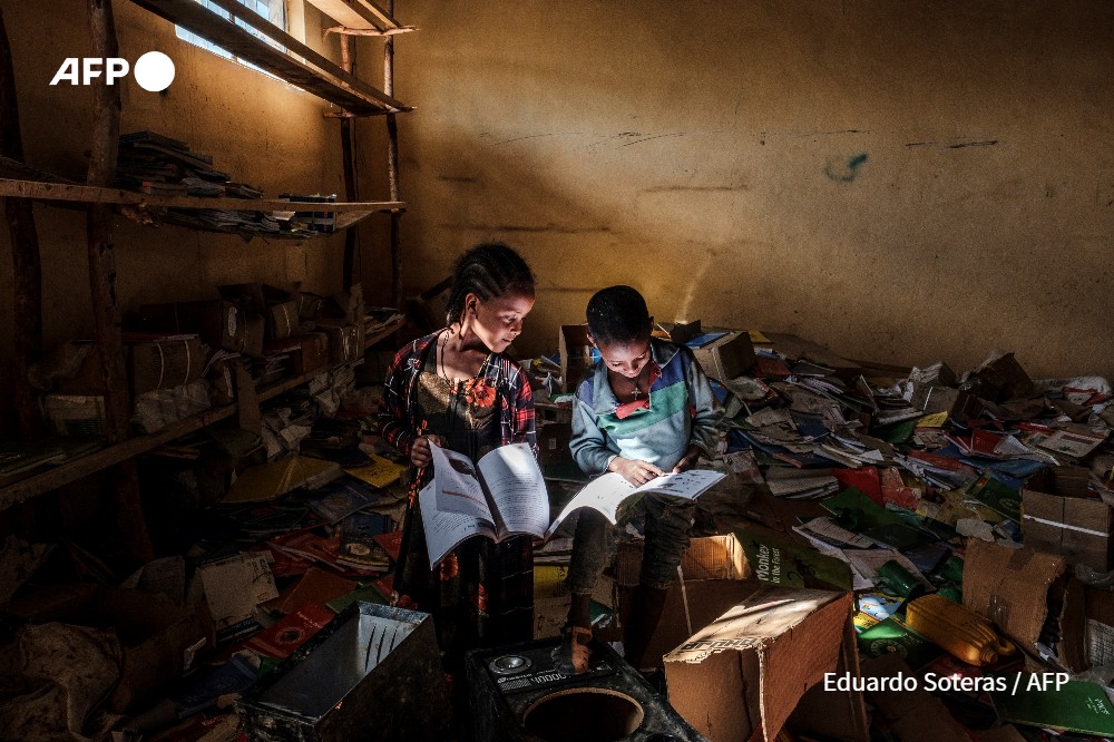 Le photographe argentin Eduardo Soteras documente la situation des enfants dans le nord de l'Éthiopie depuis 2020. Il capture ainsi des moments rares, comme celui représenté dans la photographie gagnante : deux enfants se réfugient dans les livres de la bibliothèque d'une école élémentaire détruite de la région du Tigré. Ces courts instants de bonheur se lisent dans leur sourire. C'est un moment précieux, au milieu du chaos.