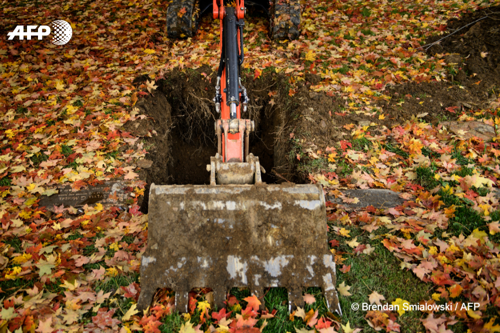 29/10/2018 – PITTSBURGH – Cette photo prise par Brendan Smialowski montre une tombe fraîchement creusée au parc commémoratif « The Tree of Life Memorial Park » alors que le ministère américain de la Justice a lancé un site web pour lutter contre les crimes haineux, deux jours après que 11 fidèles ont été abattus dans la synagogue Tree of Life.