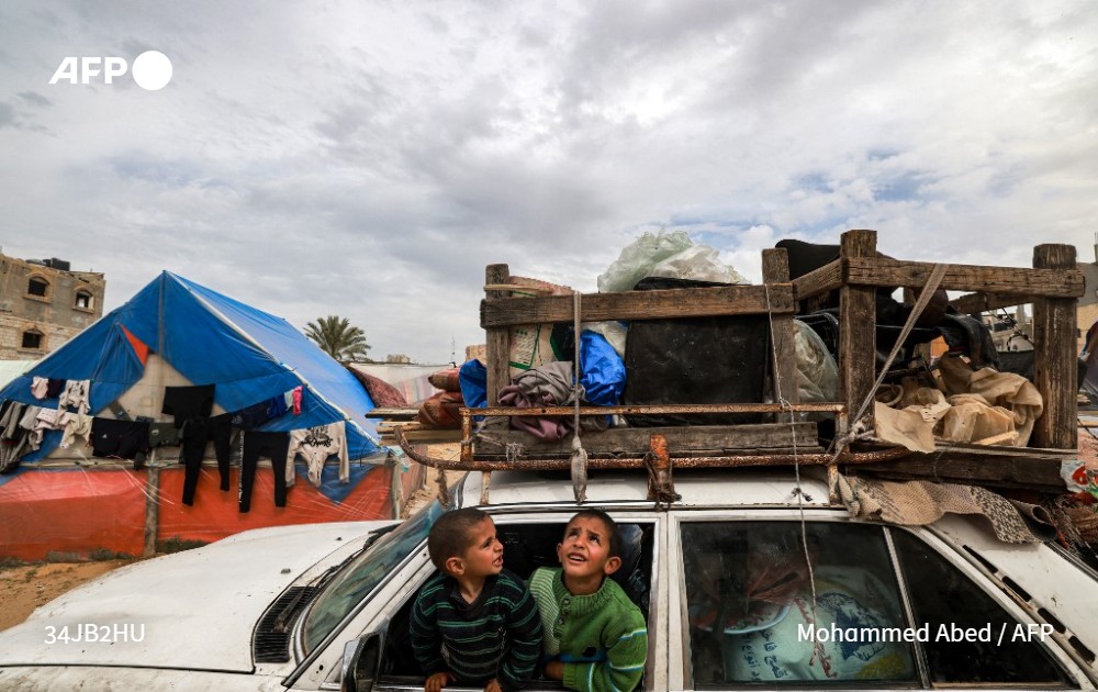 Des enfants sont assis dans une voiture alors que la population fuit Rafah dans le sud de la bande de Gaza le 13 février 2024 © Mohammed Abed / AFP