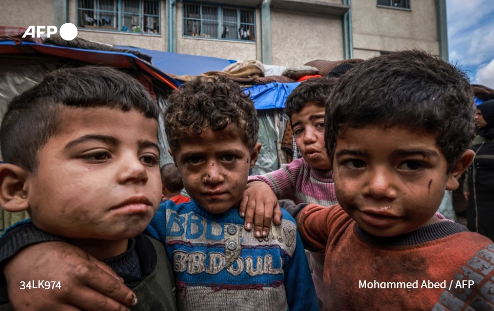 Des enfants palestiniens déplacés posent devant des abris de fortune dans un camp à Rafah le 14 mars 2024. © Mohammed Abed / AFP