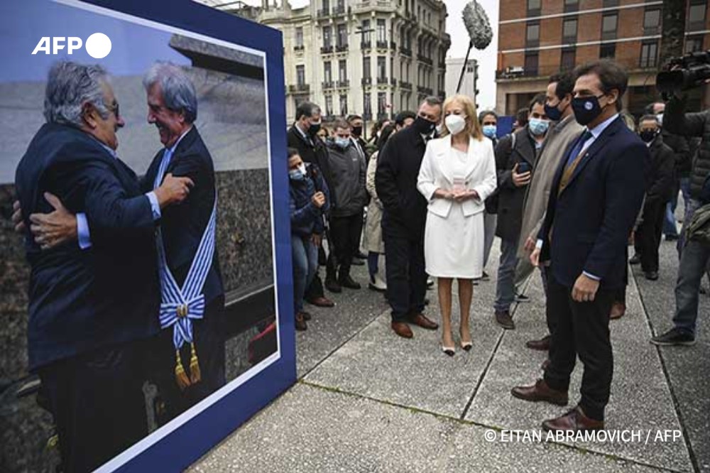 Luis Lacalle Pou, presidente del Uruguay y la alcaldesa de Montevideo Carolina Cosse asisten a la inauguración de la exposición Democracia. © EITAN ABRAMOVICH / AFP
